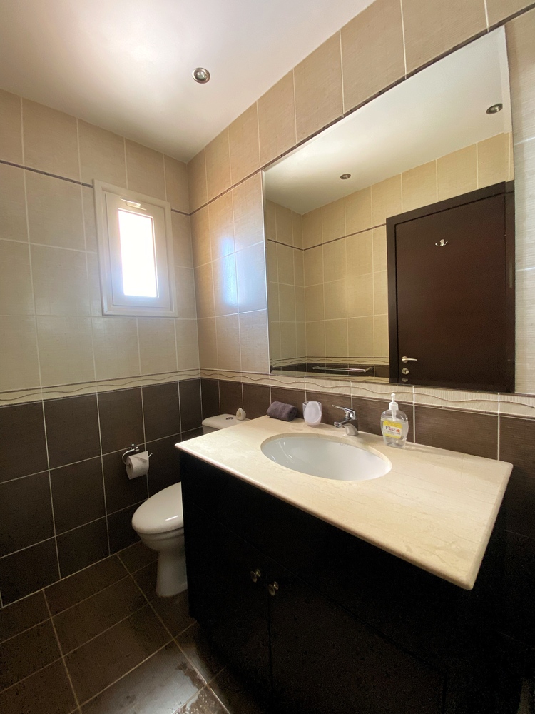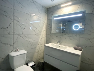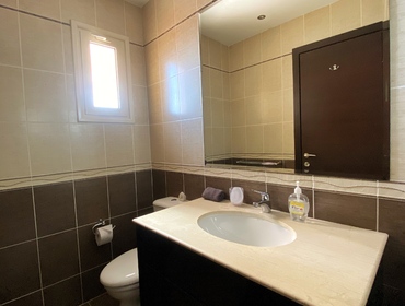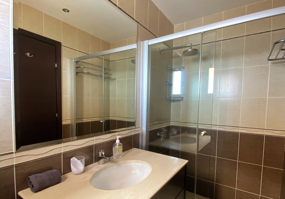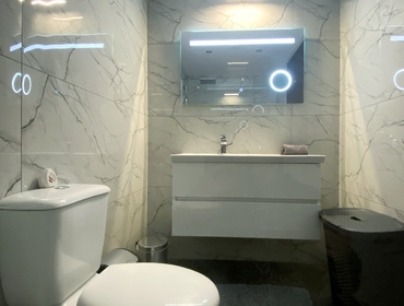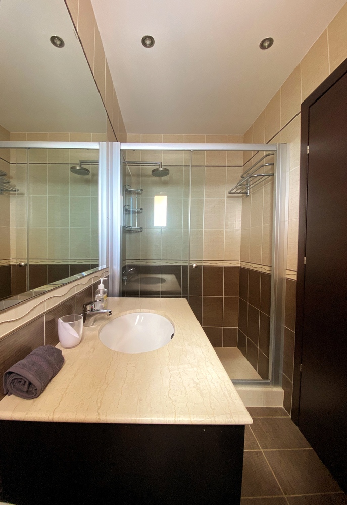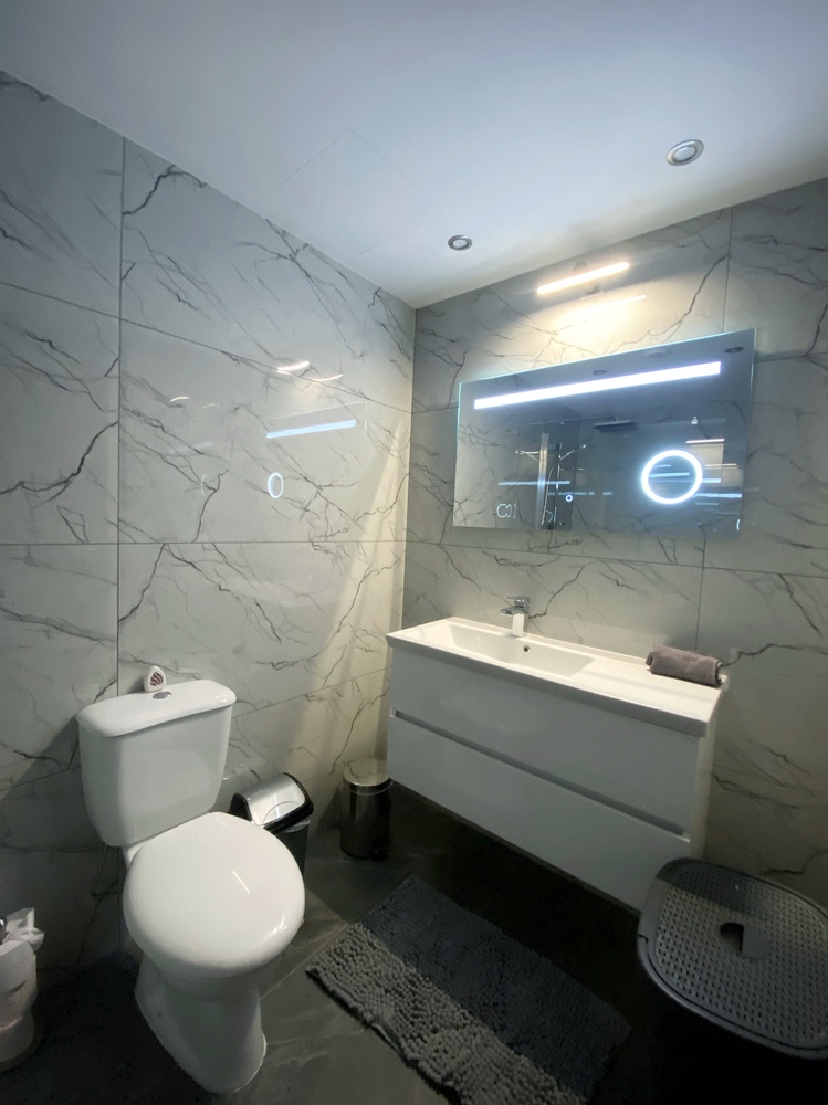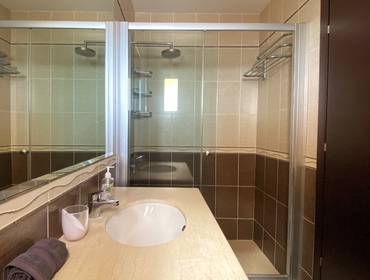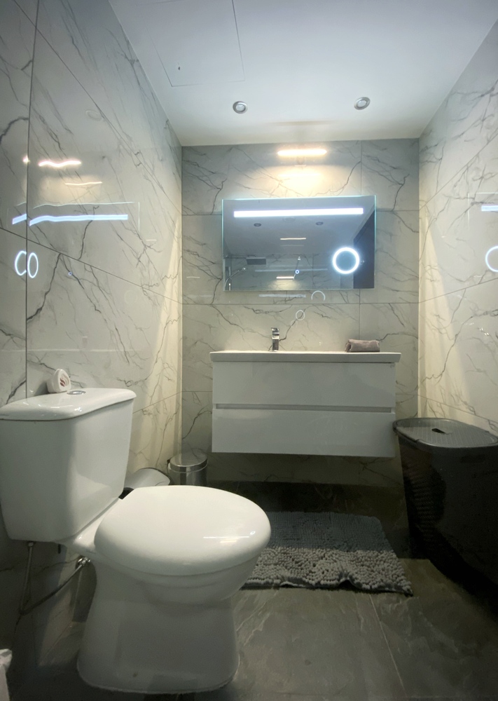 Luxurious Family Bathroom with w/c, bathtub with over shower, marble top, huge vanity mirror, and ample storage. This bathroom is shared between bedrooms 2 and 3.