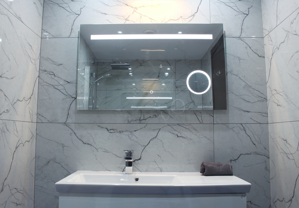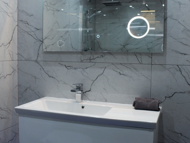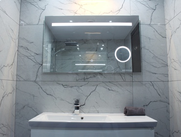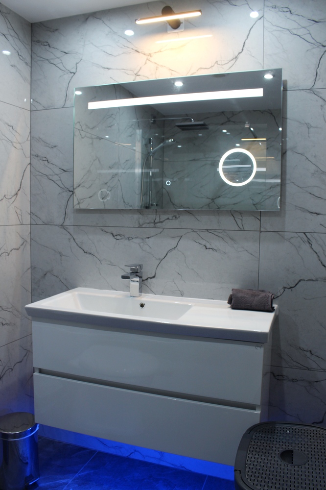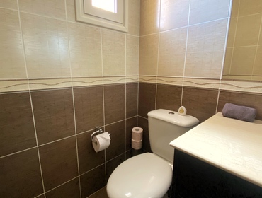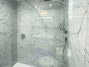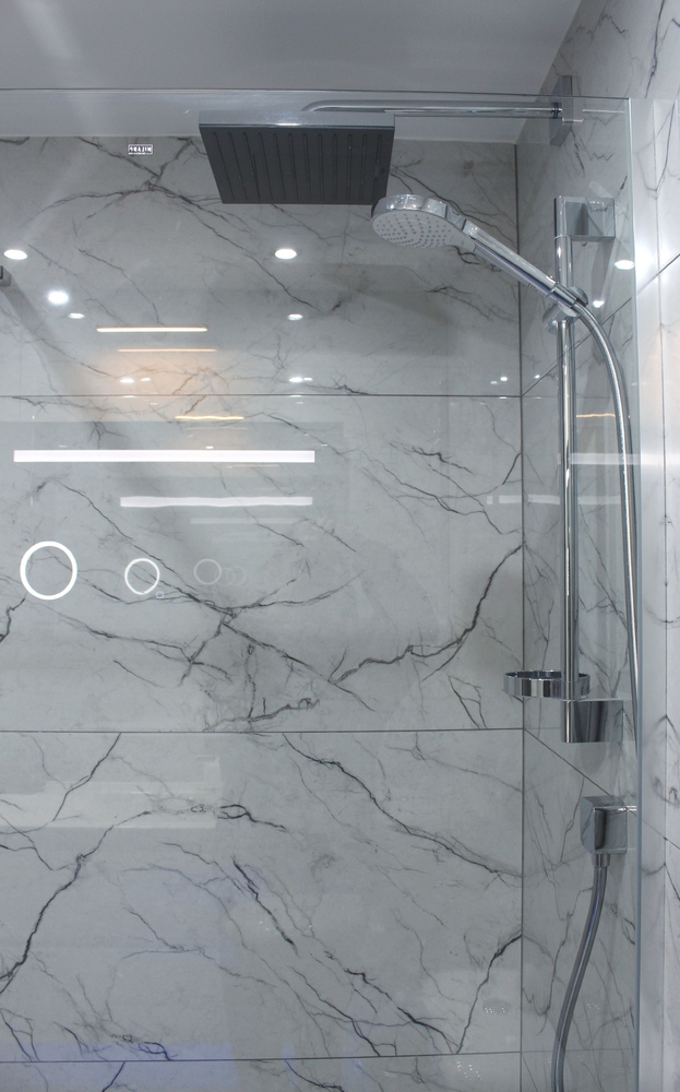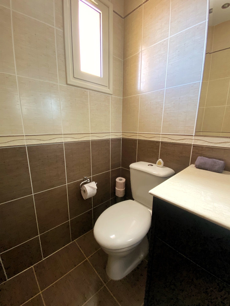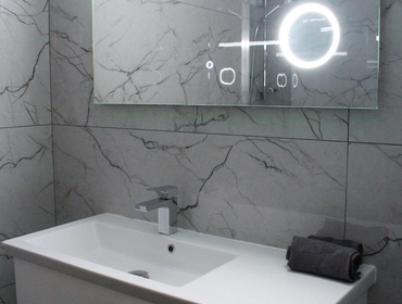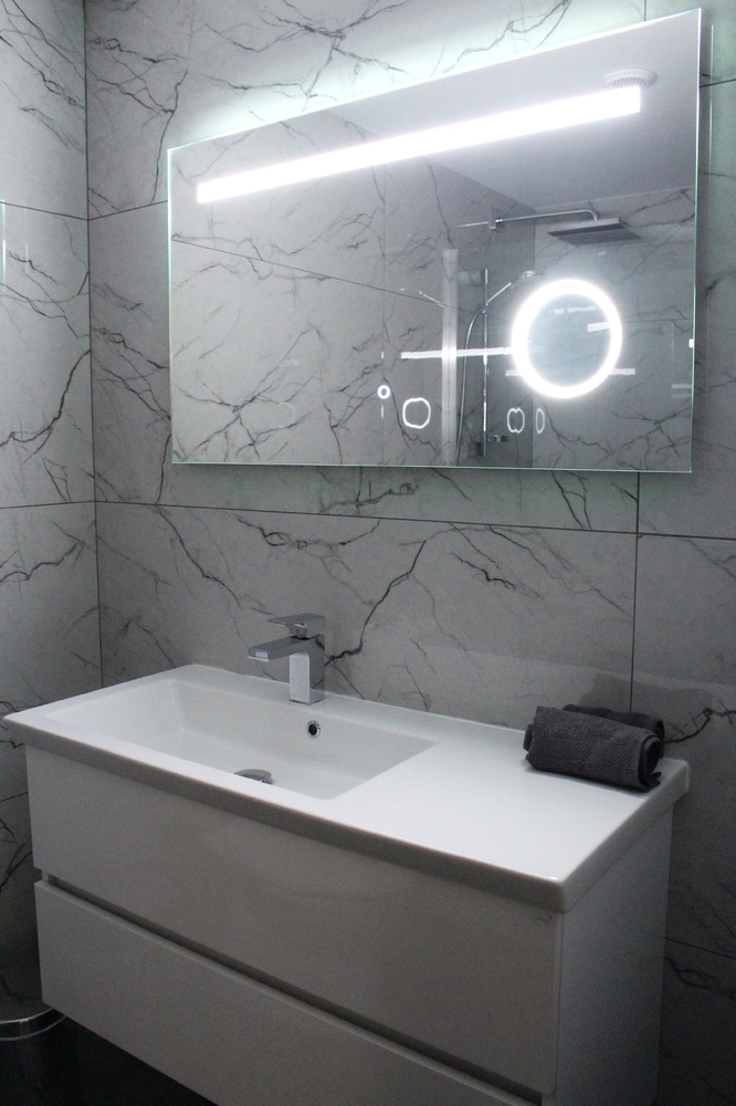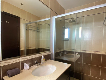 Luxurious Family Bathroom with w/c, bathtub with over shower, marble top, huge vanity mirror, and ample storage. This bathroom is shared between bedrooms 2 and 3.