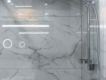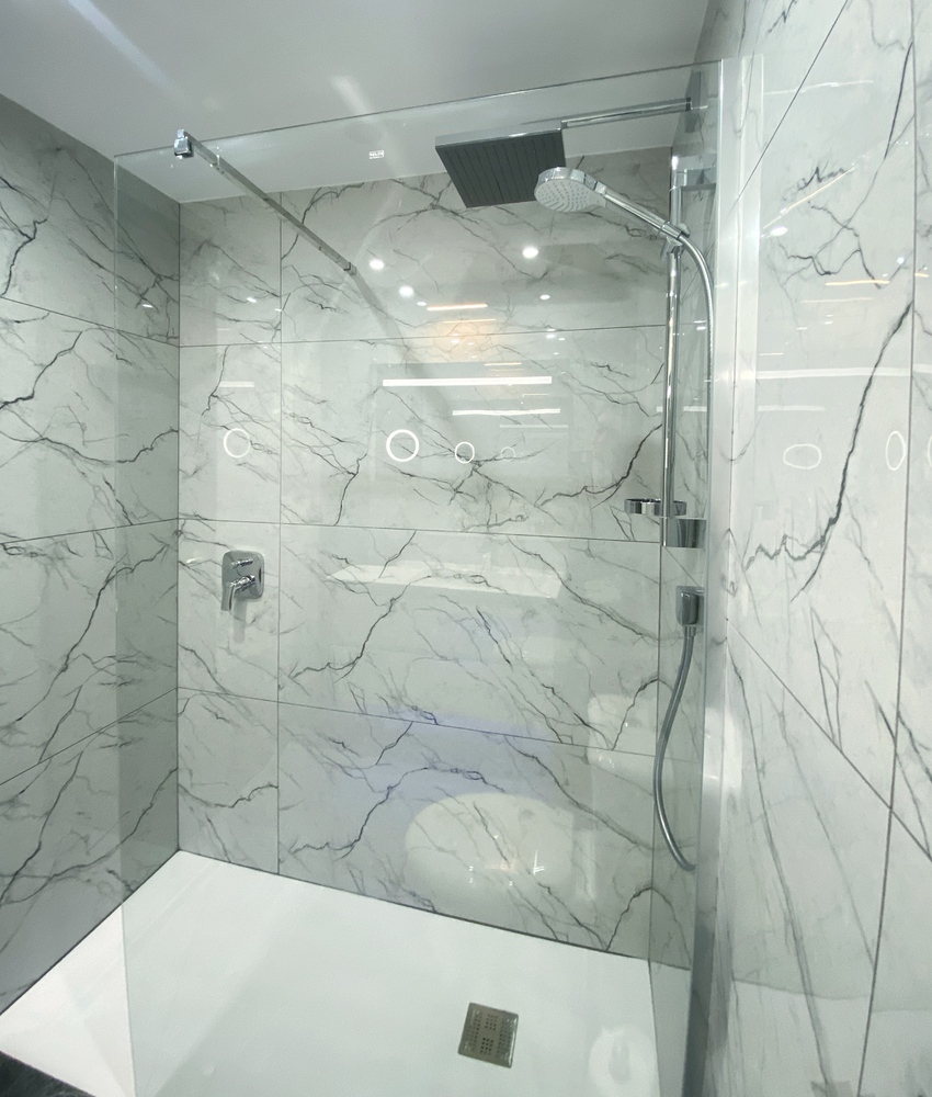 En-suite offering a double-sized walk-in shower, huge vanity mirror, ample storage, w/c.