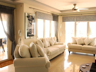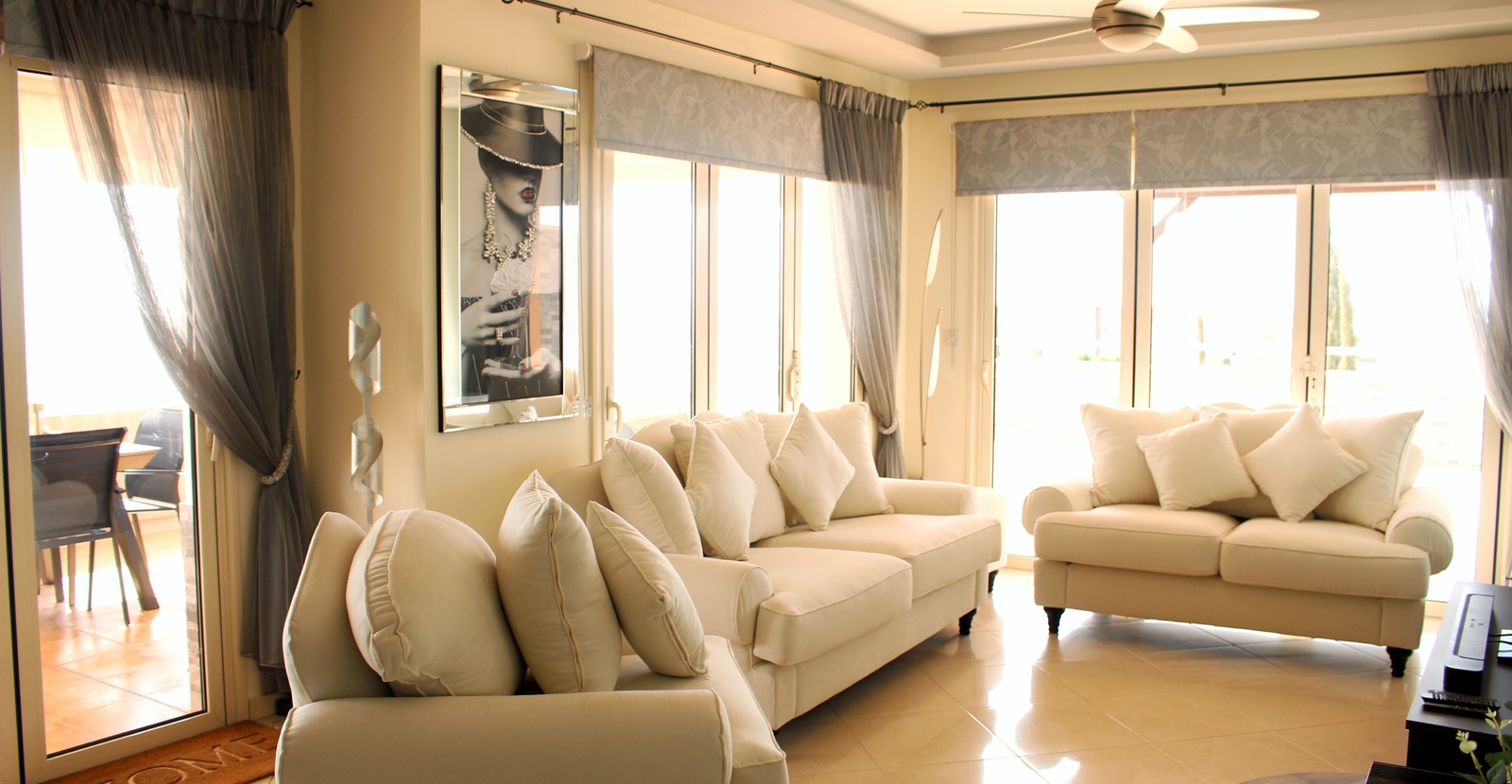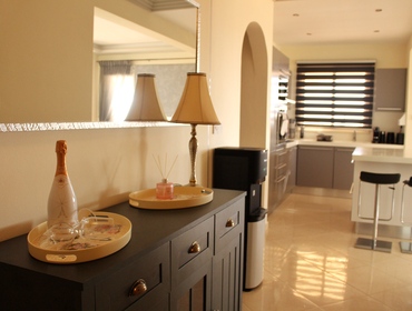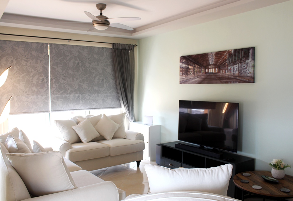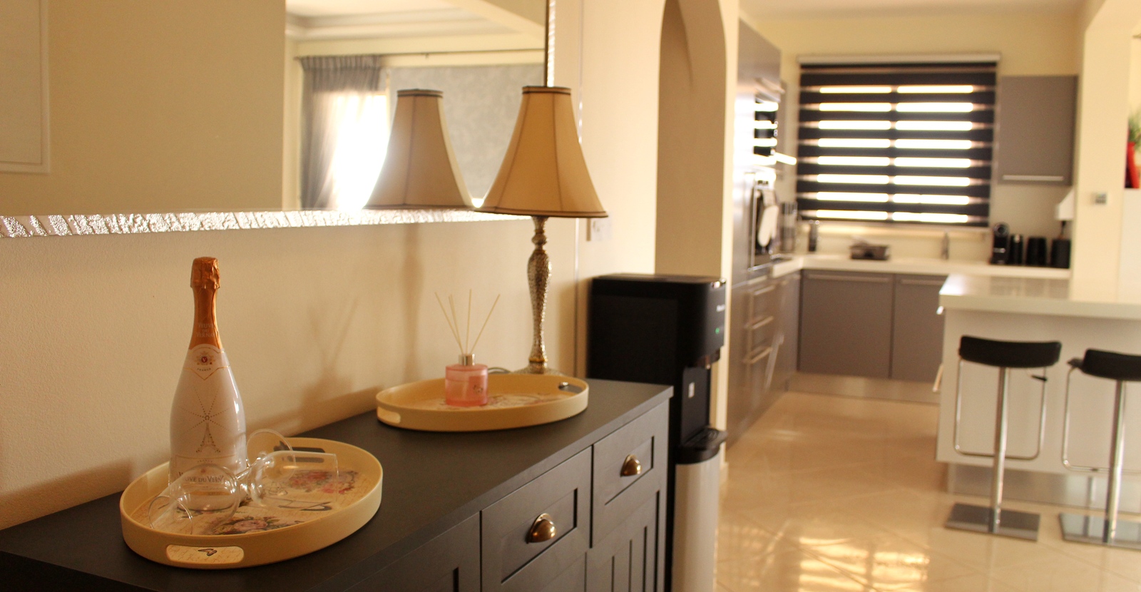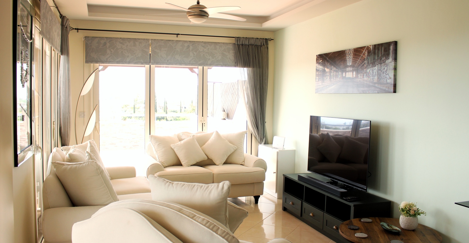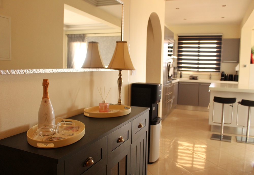 The living room comprises a stylish lounge area with bi-folding doors leading onto an extra-large terrace outdoor area, boasting stunning sea & pool views! Also, purpose-built covered Pergola, built-in gas BBQ and storage area with covered wind sail—a Chef’s delight!